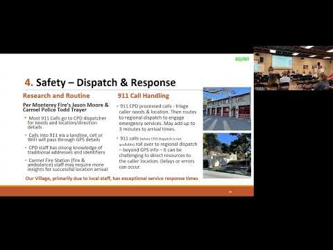 On public safety, presenters said Monterey Fire Department currently provides fire service under contract and has committed to staffing a paramedic on every response vehicle. Staff explained Carmel remains unique in Monterey County for operating its own local dispatch, which then relays calls to county dispatch; staff said that translation step can add time that is not counted in the fire department’s internal travel-time reporting. Presenters said the prototype addresses are intended to reduce on-scene searching time and make arrival times more reliable.