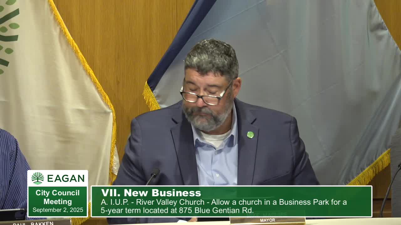 The council granted a five-year interim use permit allowing River Valley Church to continue operating at 875 Blue Junction Road in a business-park zoning district; the church has occupied the site under prior IUPs since 2011.