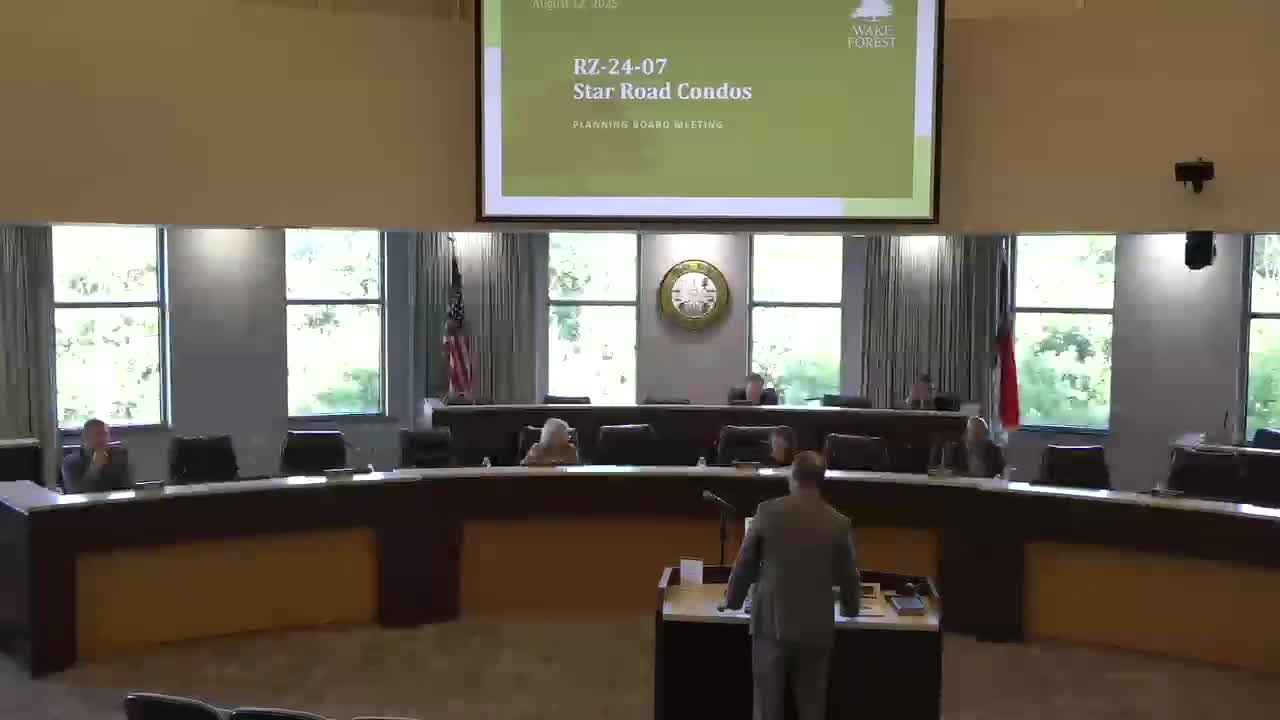 Patrick Grady, the Town of Wake Forest Development Services manager, presented RZ-24-07, a conditional rezoning and site master plan application from SJP Raleigh Durham LLC for a roughly 14-acre vacant parcel along Moonbow Trail and Timberline View Drive owned by Star Landing 2 LLC.