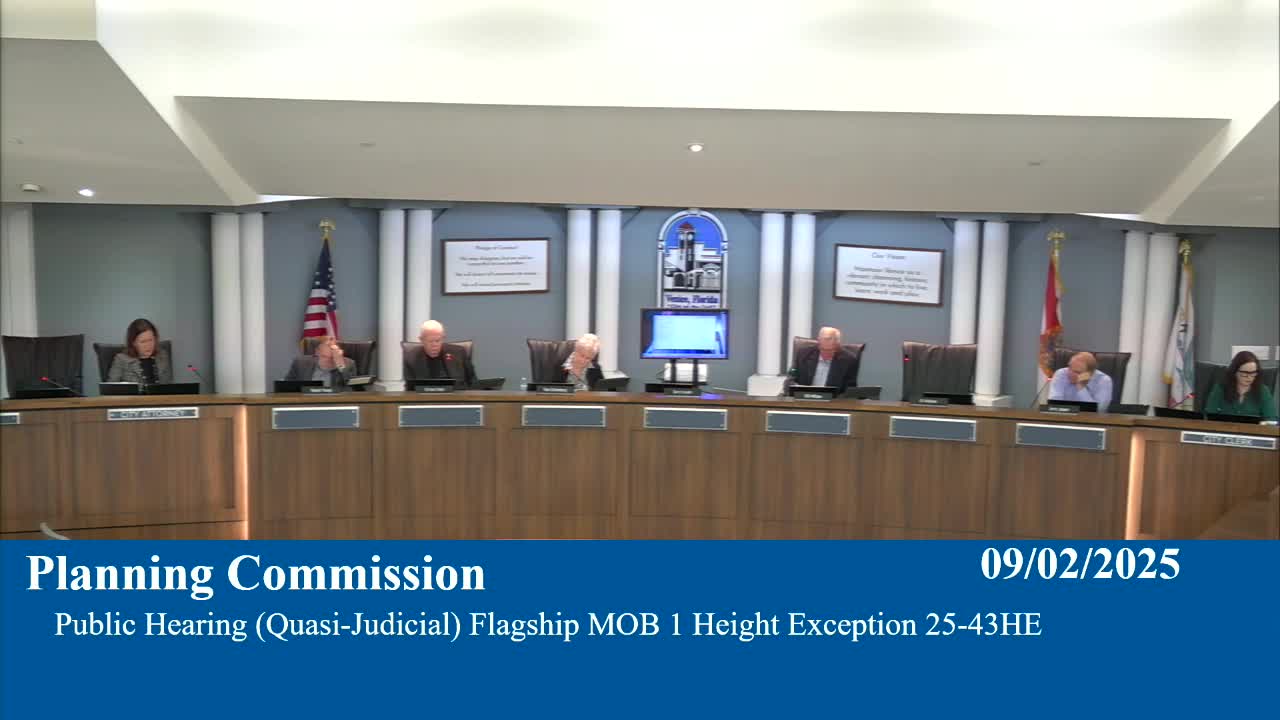 The Venice Planning Commission on Sept. 2 recommended City Council approve height exception petition 25-43 HE to allow a maximum building height of 43 feet, 4 inches for a proposed three‑story Flagship medical office building at 2695 Curry Lane.
