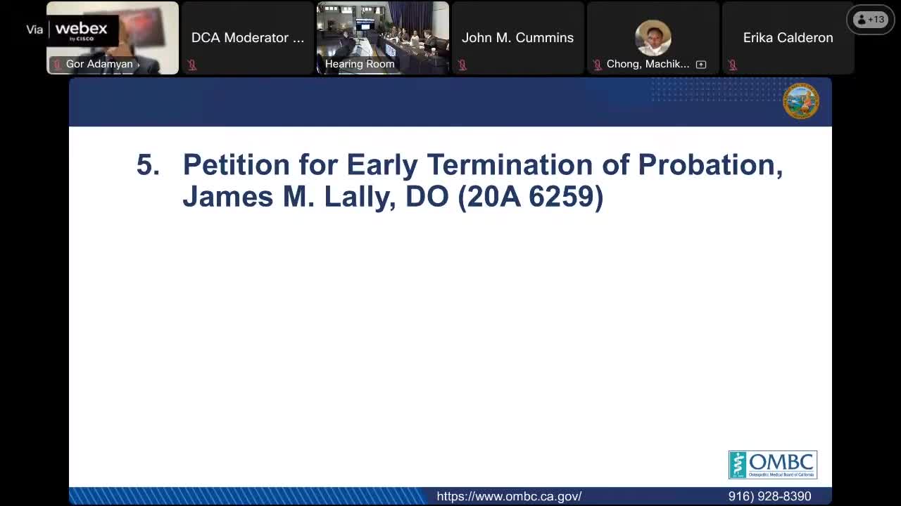 The Osteopathic Medical Board of California held a second petition hearing Aug. 14 for James M. Lally, D.O., who asked that his three‑year probation, entered under a stipulated settlement adopted July 31, 2023, be terminated early.