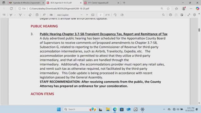 The Appomattox County Board of Supervisors adopted an amendment to the county’s transient-occupancy tax ordinance to reflect recently enacted state legislation affecting third-party accommodation intermediaries such as Airbnb and Expedia.