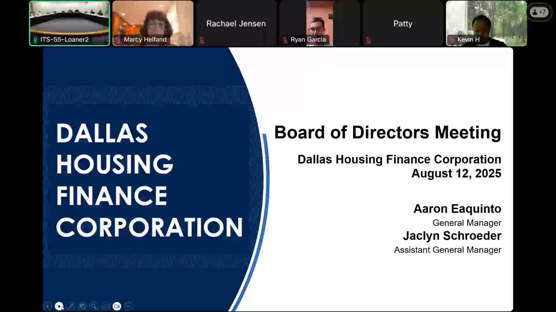 The Dallas Housing Finance Corporation voted to form a 501(c)(3) nonprofit, to be named Foundation for Dallas Housing (or another name approved by the general manager), and authorized preparation and filing of formation documents; the measure passed 10–0 with two absences and one vacant seat.