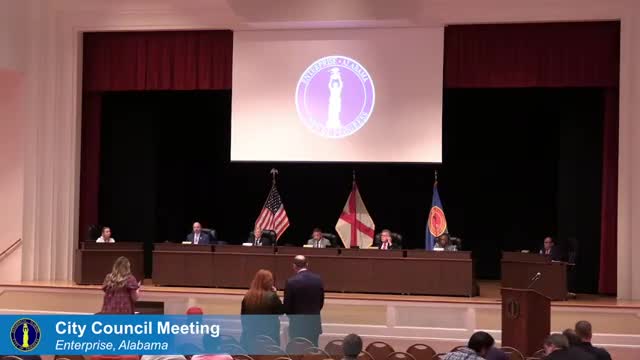 The Enterprise City Council on Oct. 21, 2025, approved a package of routine and land‑use actions including three rezoning ordinances, two street‑acceptance resolutions, a nuisance abatement order, an ABC license, and a severe‑weather preparedness sales tax holiday.