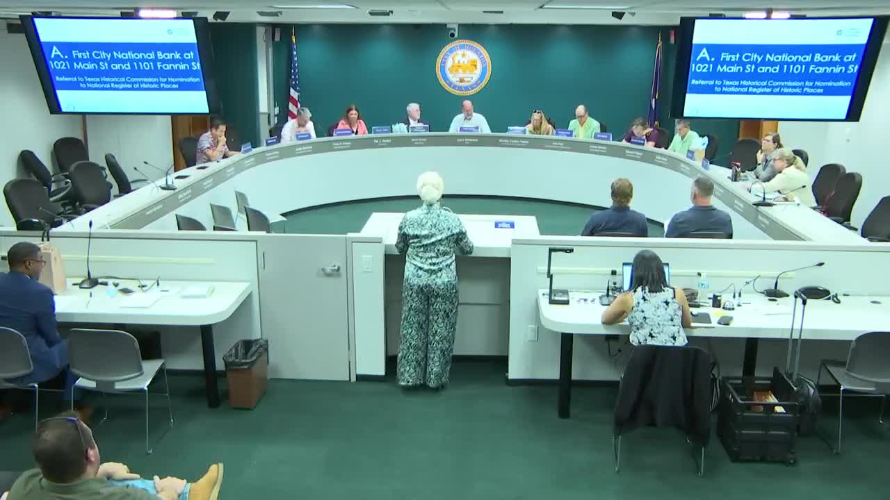 The Houston Archaeological and Historical Commission signaled support for three nominations — First City National Bank (1021 Main/1101 Fannin), Inwood Manor (3711 San Felipe) and Margaret Root Brown College (Rice University) — and cleared staff to forward the referrals to the Texas Historical Commission for final consideration.