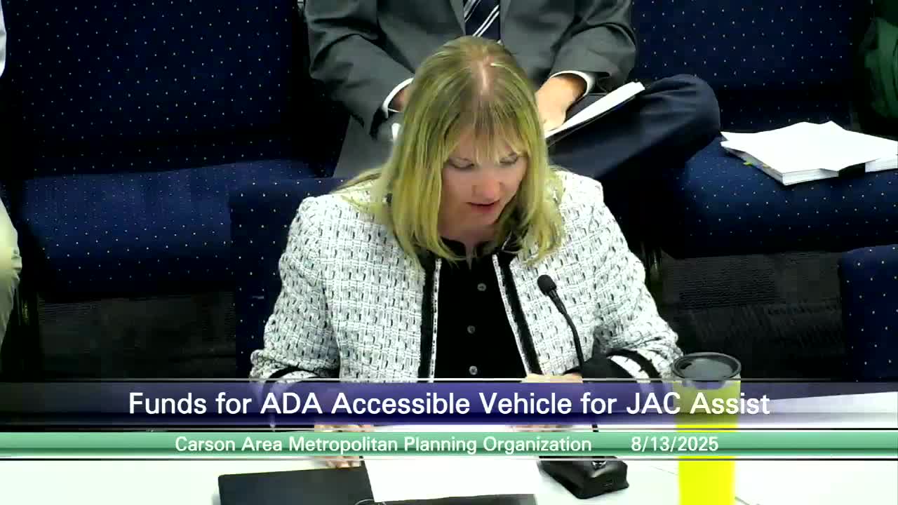 The CAMPO board on Aug. 13 approved three funding actions: award of FTA Section 5339 funds totaling $122,280 to the Carson City Regional Transportation Commission (RTC) for purchase of an Americans with Disabilities Act–accessible bus; award of FTA Section 5310 funds totaling $200,155 to the RTC to offset operating expenses for the Jump Around Carson (JAC) paratransit program; and authorization to execute highway agreement PR235-25-063 with the Nevada Department of Transportation for a feasibility study of a proposed East Dayton Valley bridge and associated roadway connections.