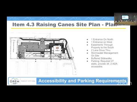 The Orem Planning Commission approved a preliminary subdivision and site plan for Raising Cane's at 11 West Center Street, including demolition of the existing Burger King. The site plan includes a two-lane drive-through, enhanced landscaping and parking above minimum requirements.