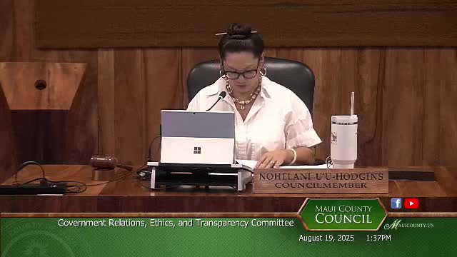 The Maui County Government Relations, Ethics and Transparency Committee on Aug. 19 voted to recommend that the council include the Psychology Interjurisdictional Compact (PSYPACT) in the 2026 Hawaii State Association of Counties (HSAC) legislative package and in the county's own 2026 legislative package. The committee recommended adoption of Resolution 25-153 (state package) by an 8-0 voice vote and Resolution 25-154 (Maui County package) by a 7-0 voice vote; both items will go forward to the full council for consideration.