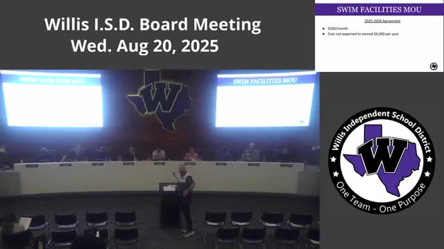 Trustees approved a memorandum of understanding with the Girl Scouts of San Jacinto County to provide access to a pool for Willis ISD’s swim program; private donors will fund the heater and the district agreed to a modest monthly utility payment not to exceed $6,000 per year.