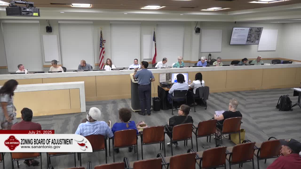 The San Antonio Board of Adjustment on July 21 considered a batch of zoning variances and special exceptions across multiple neighborhoods, approving most requests, denying an appeal about a mobile food court, and continuing one major accessory‑structure request for further neighborhood coordination.
