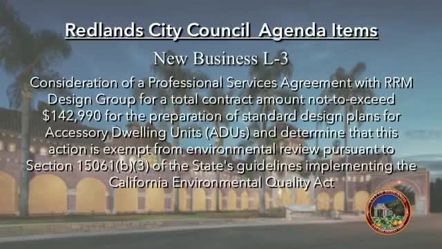The Redlands City Council on Tuesday approved a professional-services agreement with RRM Design Group to create pre-approved accessory dwelling unit (ADU) standard plans and directed staff to make the final ADU plans available to homeowners at no charge.