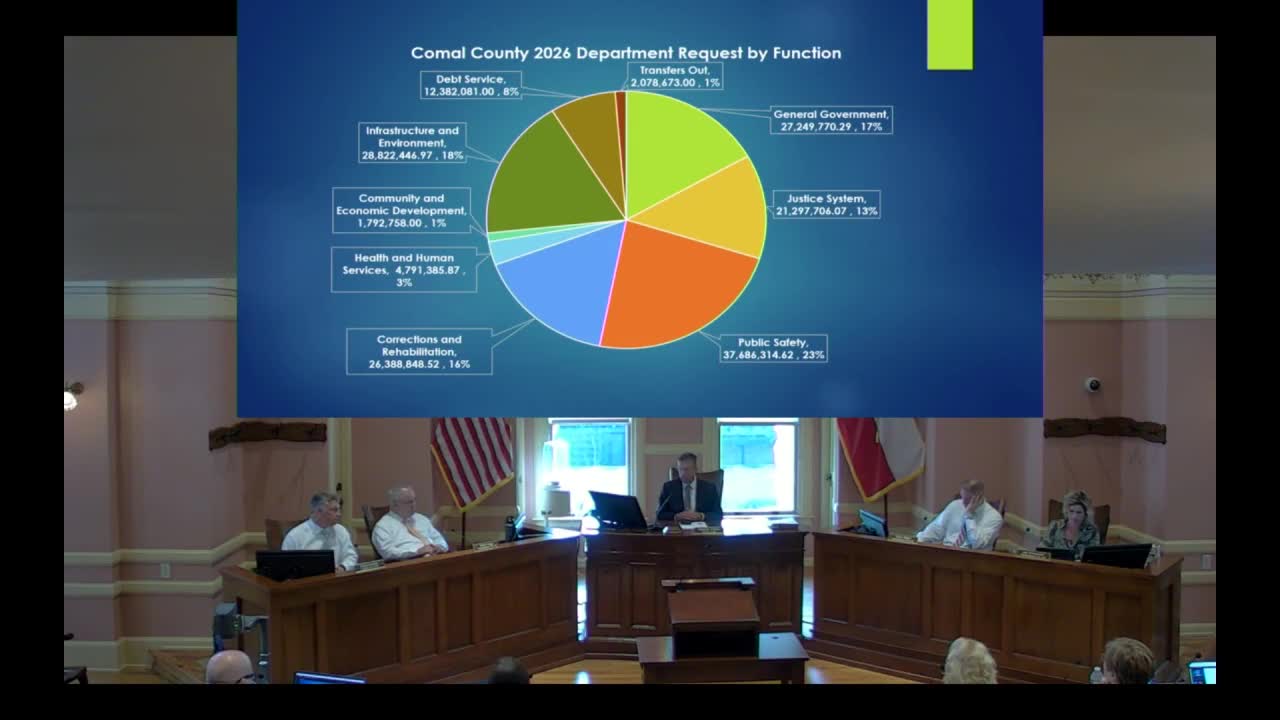 Comal County Commissioners Court on Wednesday reviewed department-level requests for the county's 2026 budget, which total about $162,500,000 in department submissions. Presenters said public safety, corrections and the justice system account for more than half of the county’s spending and drove a number of personnel and equipment requests across departments.