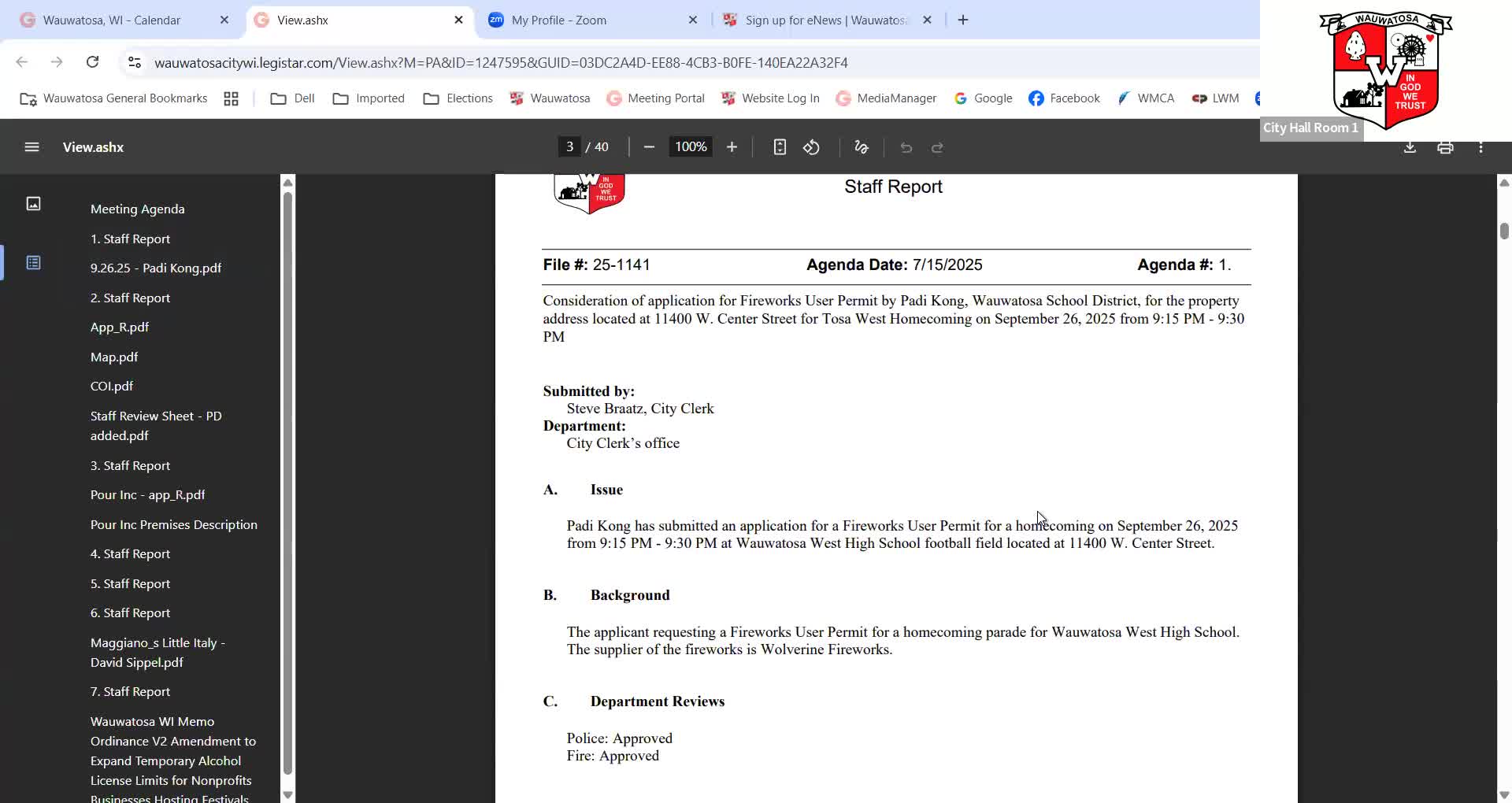 The fireworks-user permit, requested by the Wauwatosa School District for Tosa West Homecoming on Sept. 26, was described by a district representative, Chris Ennis, as “the same firework show every year. It’s very quick. Lasts about 10 minutes.” Staff told the committee the police and fire departments had reviewed and approved the application. Alder First moved approval; Alder Phillips seconded. The motion passed.
