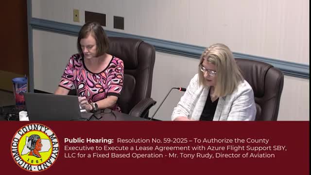 The council postponed action on Resolution 59‑2025, a proposed 20‑year lease and operating agreement with Azure Flight Support SBY LLC to operate a fixed‑base operation at the regional airport. After more than an hour of public comment and a detailed staff briefing the council voted unanimously to postpone the lease for follow‑up with the company and additional information for current general‑aviation users.