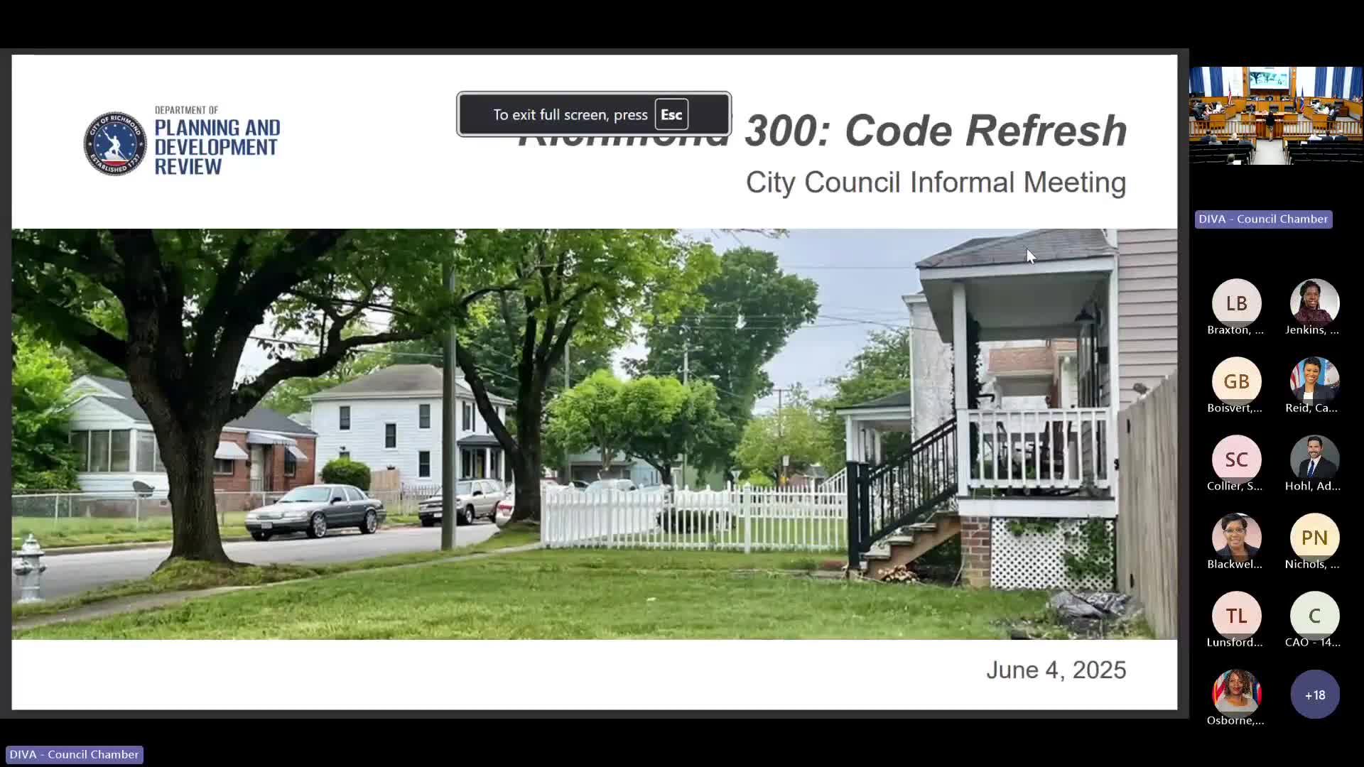 At an informal meeting, the Richmond City Council received an update from Mary Anne Pitts, deputy director of the Planning Department, on the city's code refresh project, a multi-module rewrite of Richmond's zoning ordinance that staff says is moving from background work into drafting a new ordinance and a draft zoning map.