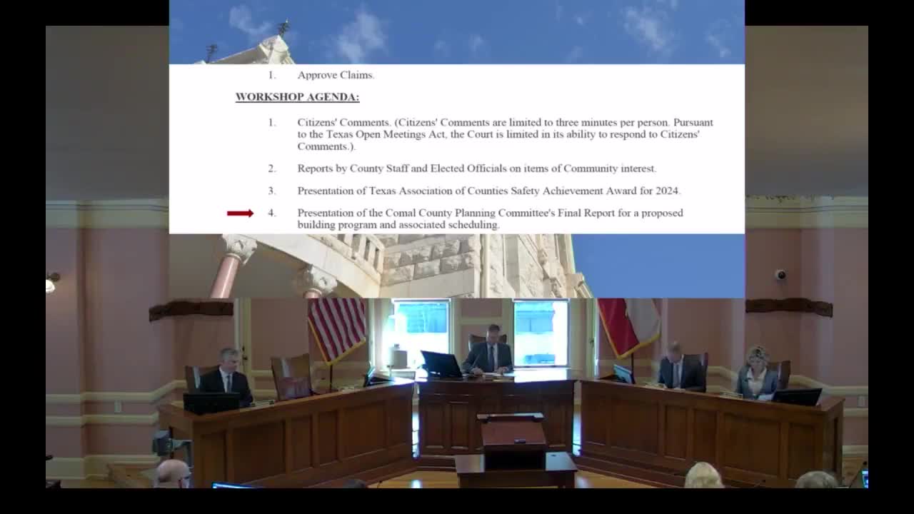 Comal County staff presented the Planning Committee’s final report on a proposed county building program and schedule, outlining two financing scenarios that prioritize a jail expansion, several satellite office projects and road work.