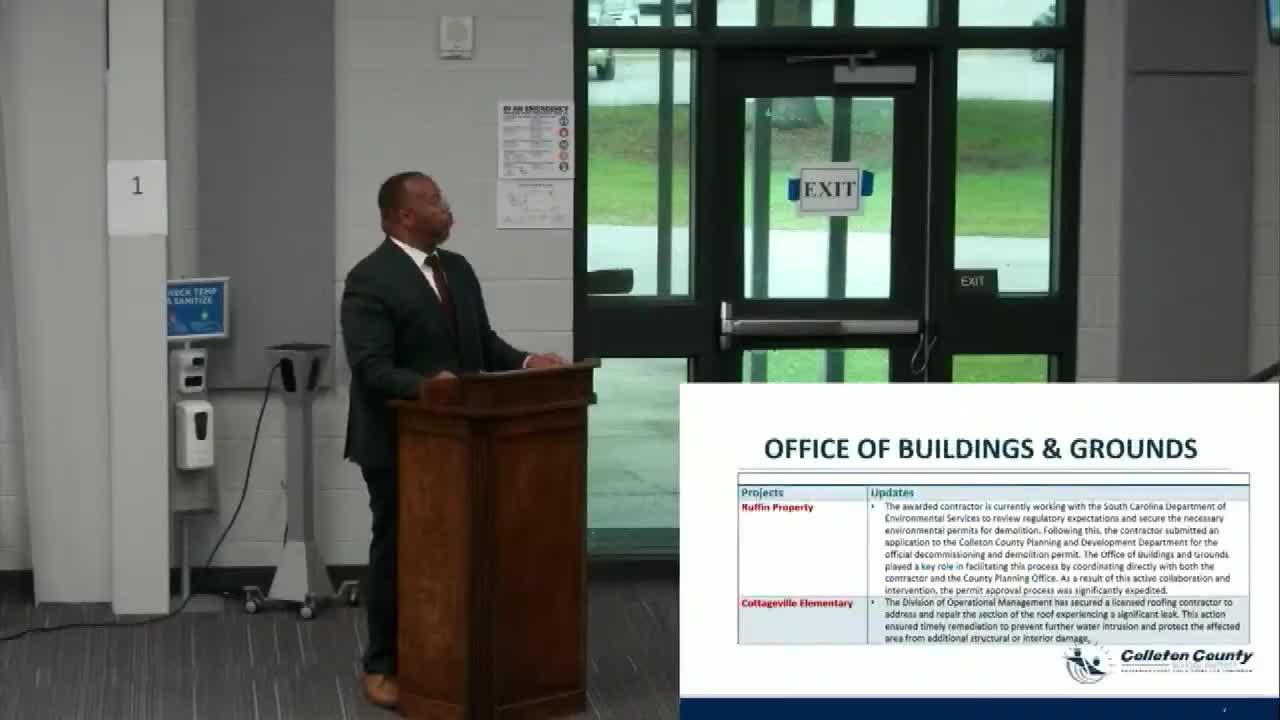 He told trustees the district had repaired an isolated roofing issue at Cottageville Elementary School that had caused water intrusion in the spring months. Wright also reported an air‑conditioning issue at Colleton County Middle School was resolved the day after a recent event, and the division plans an RFP to identify vendors that can provide assessment, repairs and on‑call services for HVAC work going forward.