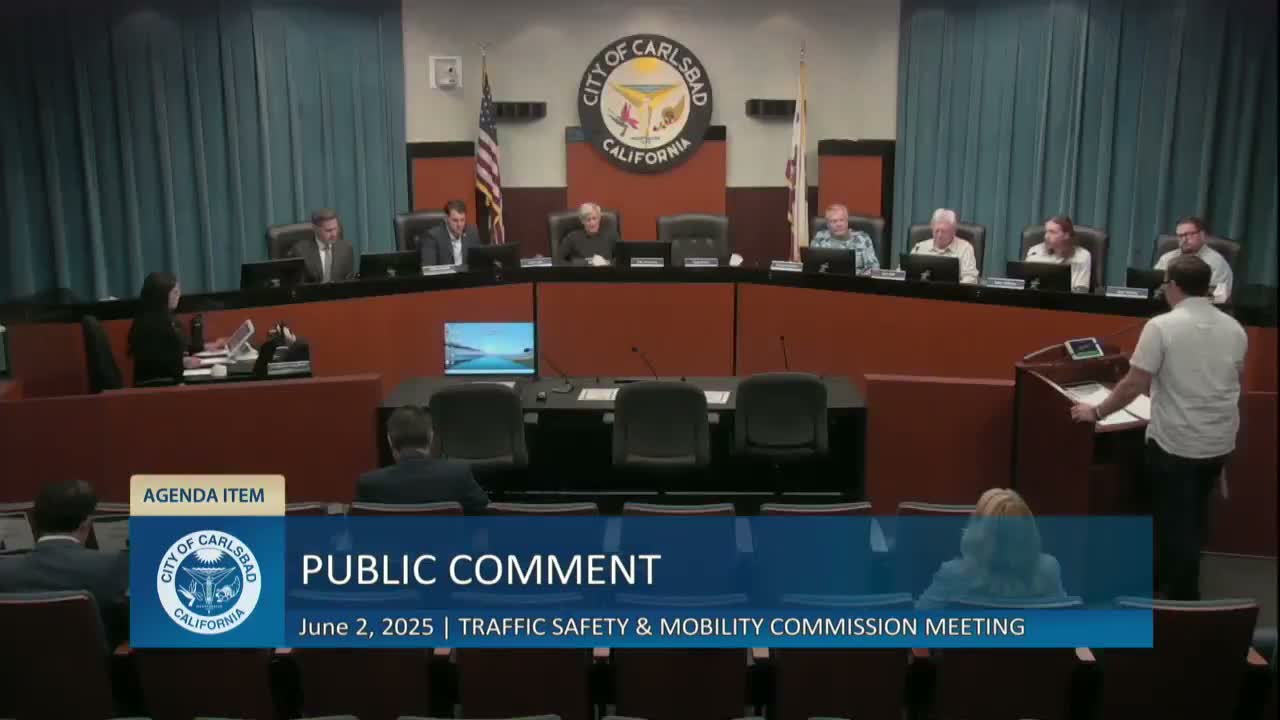 The Carlsbad Chamber of Commerce told the commission that commercial vehicles at an industrial business park recently received citations under the city's oversized-vehicle ordinance; staff said Chamber and departments will work on a citywide policy and bring recommendations to the commission within weeks.