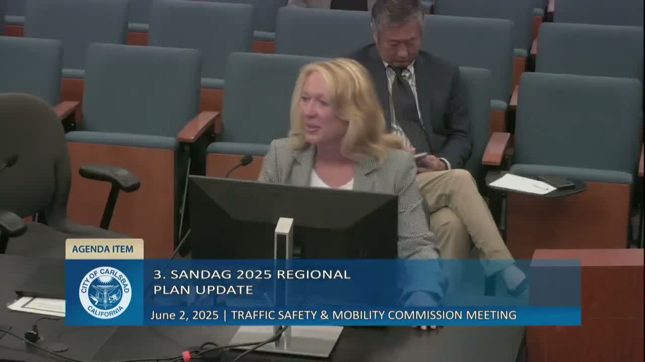 Jennifer Williamson, deputy director for mobility planning at SANDAG, presented the draft 2025 Regional Plan to Carlsbad's Traffic Safety Mobility Commission, describing the plan as a multi‑decade, multimodal program that pares back some prior large‑rail proposals and focuses on deliverable near‑term projects, greenhouse‑gas reductions and active transportation.
