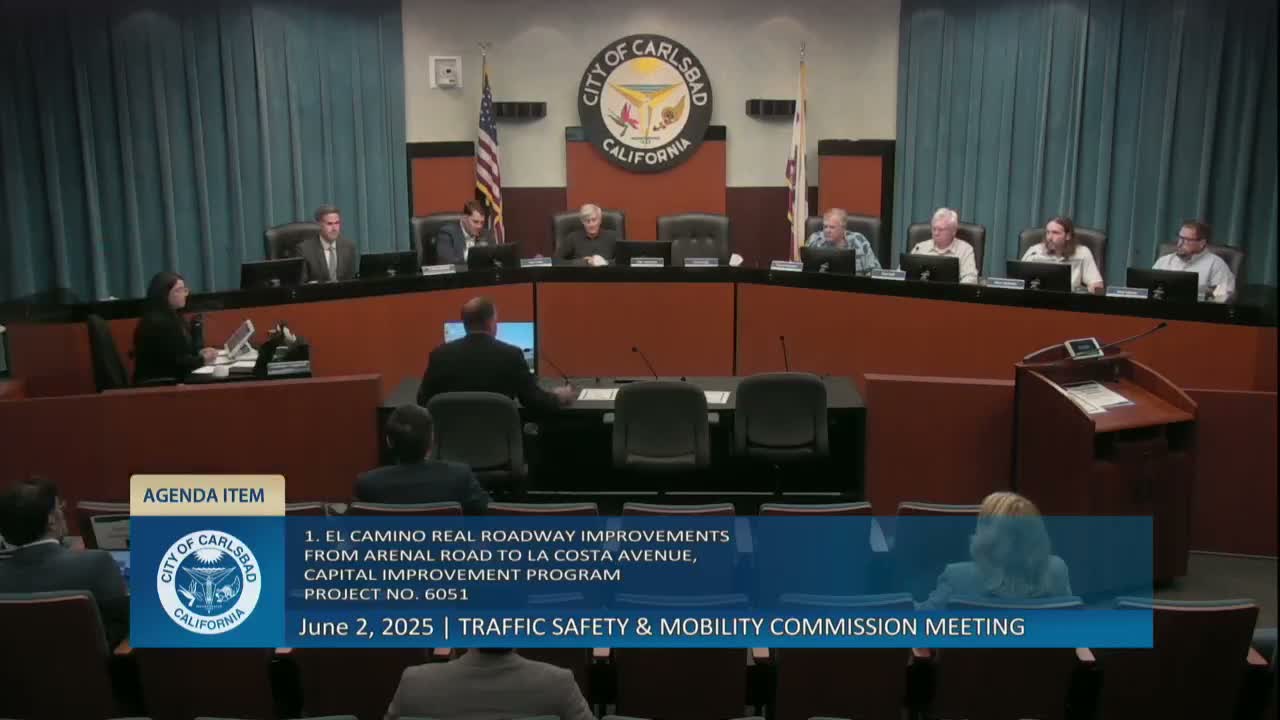The Carlsbad Traffic Safety Mobility Commission voted 6-0 to support plans to widen El Camino Real between Arenal Road and La Costa Avenue, adding a third southbound lane, sidewalks, street lights and two pedestrian bridges; staff said bids are expected in early 2026 and construction could begin in spring 2026.