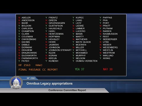 The Senate approved House File 2563, the four‑fund Legacy appropriation bill, after debate about transparency and project prioritization. Passage was 37–30. Critics raised concerns about large land acquisitions, diminished local tax base (PILT), and priority project lists and caps that could limit funding for festivals and community events.