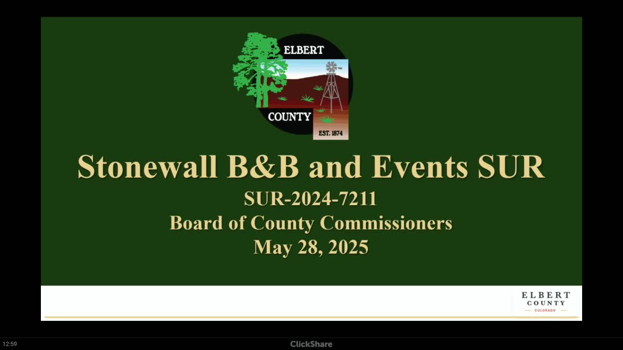 The Elbert County Board of County Commissioners voted unanimously to approve the Stonewall Bed and Breakfast and Events special use by review (case SUR-2024-77211), allowing a year-round bed-and-breakfast and up to 120 guests at special events on a 1.48-acre parcel near the community of Elbert.