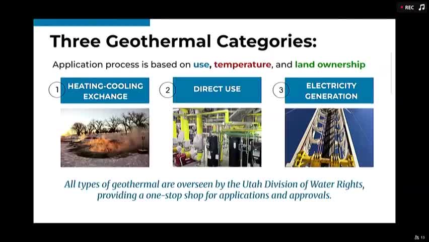 The committee advanced proposed changes to Utah’s geothermal code intended to reduce uncertainty for developers and codify long‑standing agency practice that ties geothermal rights to surface interest while preserving Utah’s relatively fast permitting process.