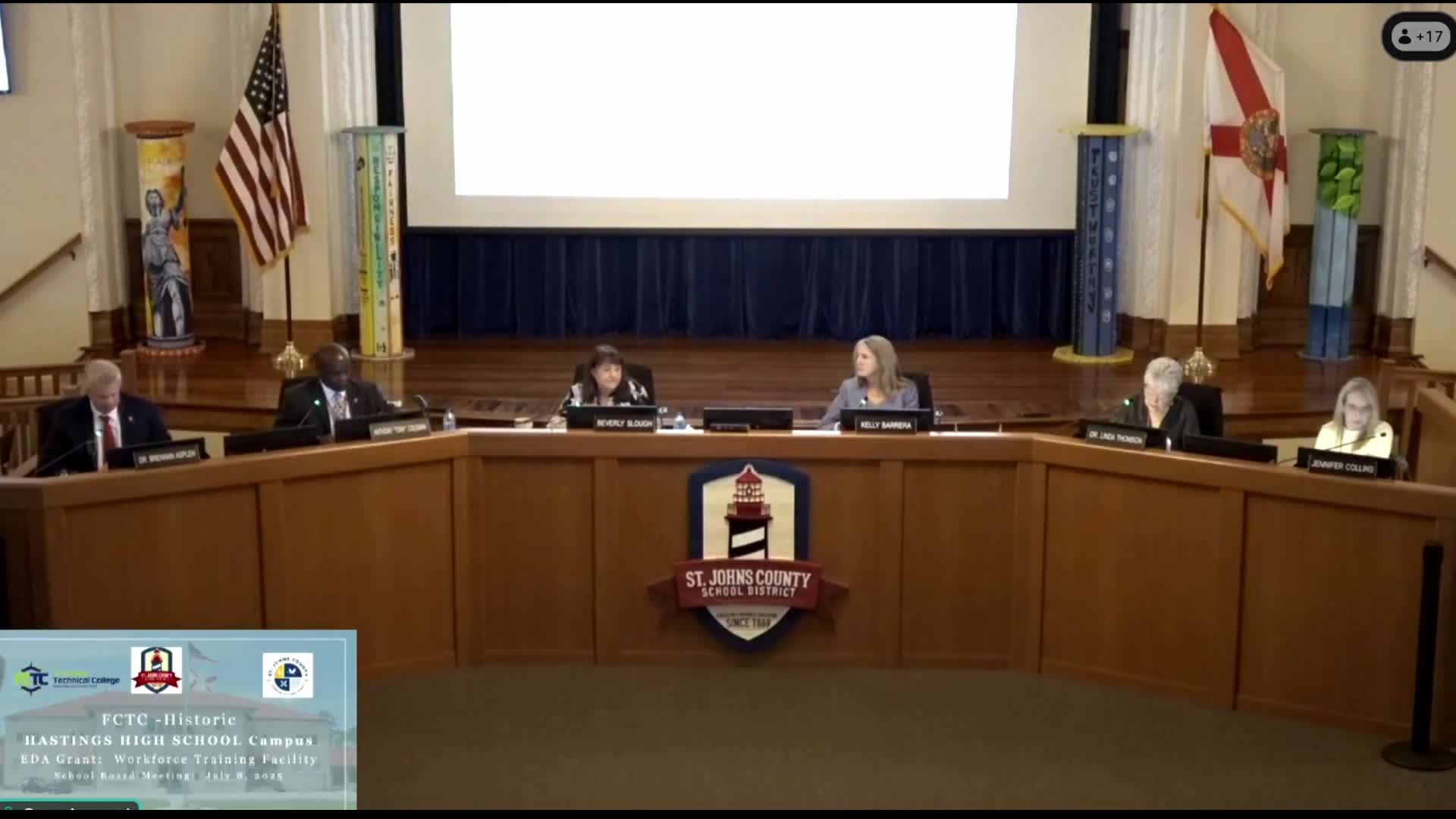 The St. Johns County School Board approved an MOU allowing EDA federal funds and a local match to fund a 20,000-square-foot FCTC workforce training facility on the Hastings High School site.