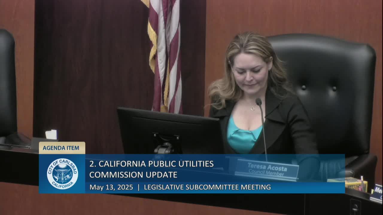 The California Public Utilities Commission updated the Carlsbad subcommittee on energy affordability measures, SDG&E’s general rate case outcomes, new rules for energy storage safety, broadband grant programs and rail crossing and quiet‑zone rules; CPUC staff urged early engagement on rail crossing projects.