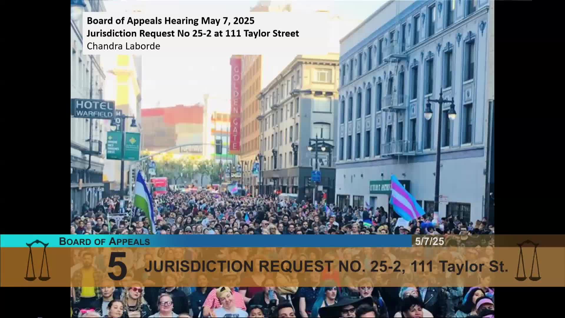 The San Francisco Board of Appeals on May 7 granted a jurisdiction request from neighborhood advocate Chandra Laborde, allowing a late appeal of a January 2025 letter of determination for 111 Taylor Street to proceed. The board voted 4–0 to find that the city’s notice procedures had inadvertently prevented Laborde from filing a timely appeal.