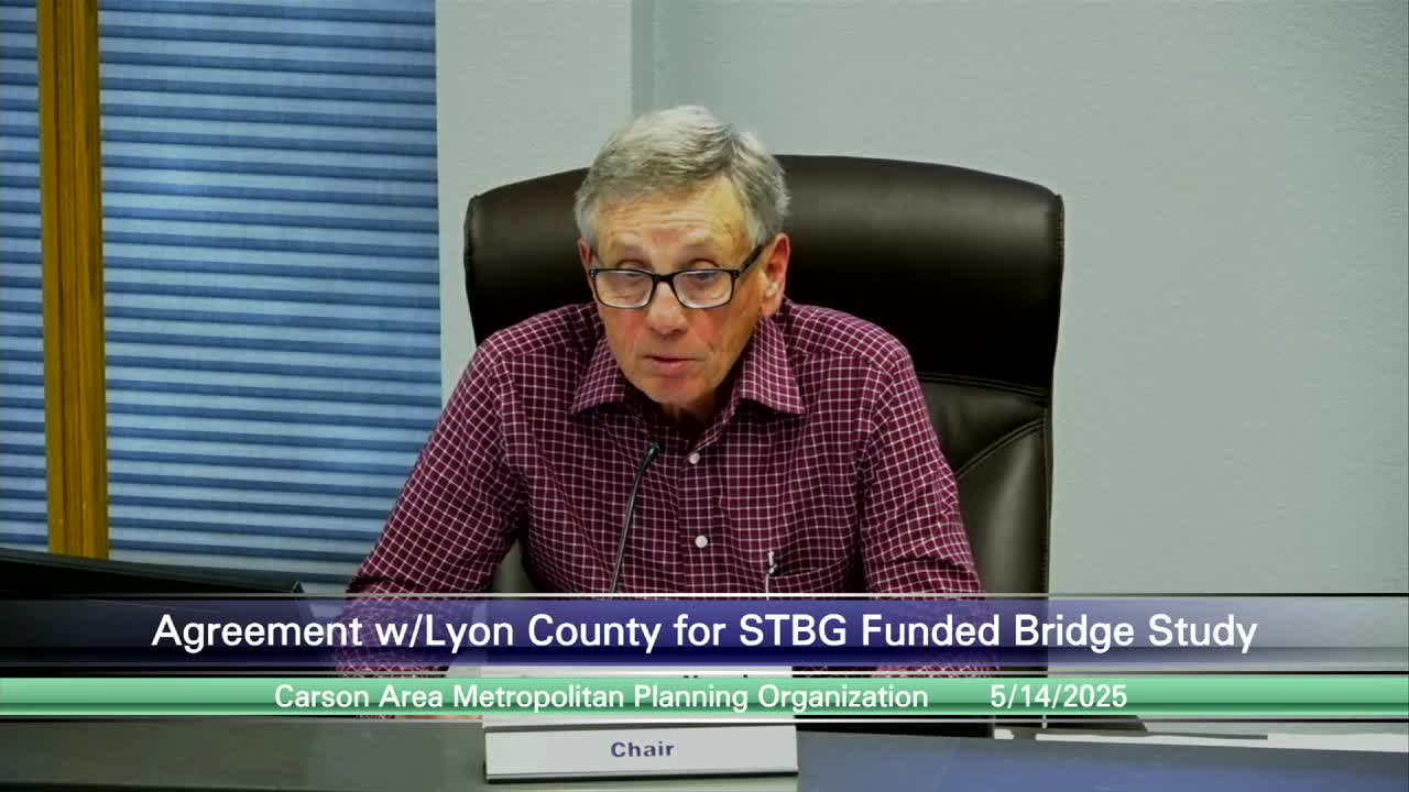 The Carson Area MPO authorized CAMPO staff to administer $1,254,000 in Surface Transportation Block Grant funds on behalf of Lyon County for a Dayton Valley Chaves Road bridge feasibility study; Lyon County must provide a 5% local match ($66,000).