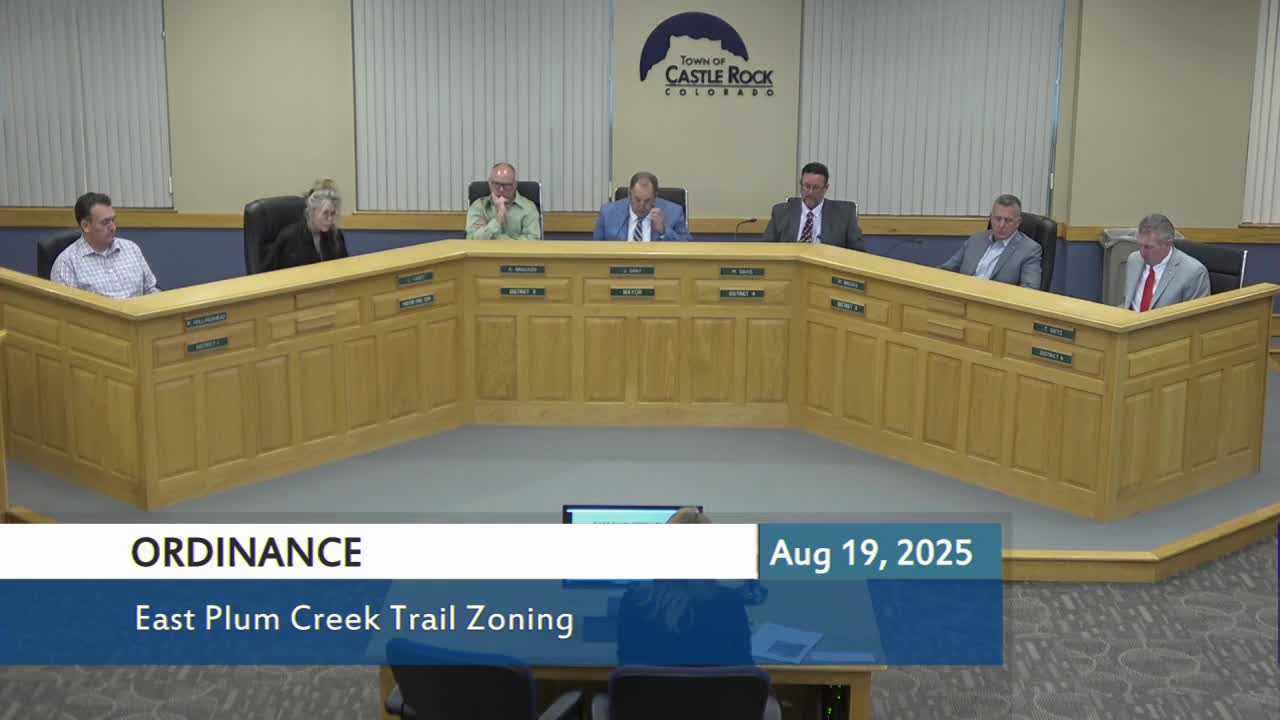 Council voted unanimously to annex and zone a 0.21‑acre sliver of land on the Plum Creek Trail into Castle Rock, changing it from Douglas County agricultural zoning to Town PL‑2 public land zoning so the town may continue to use it as a trail.