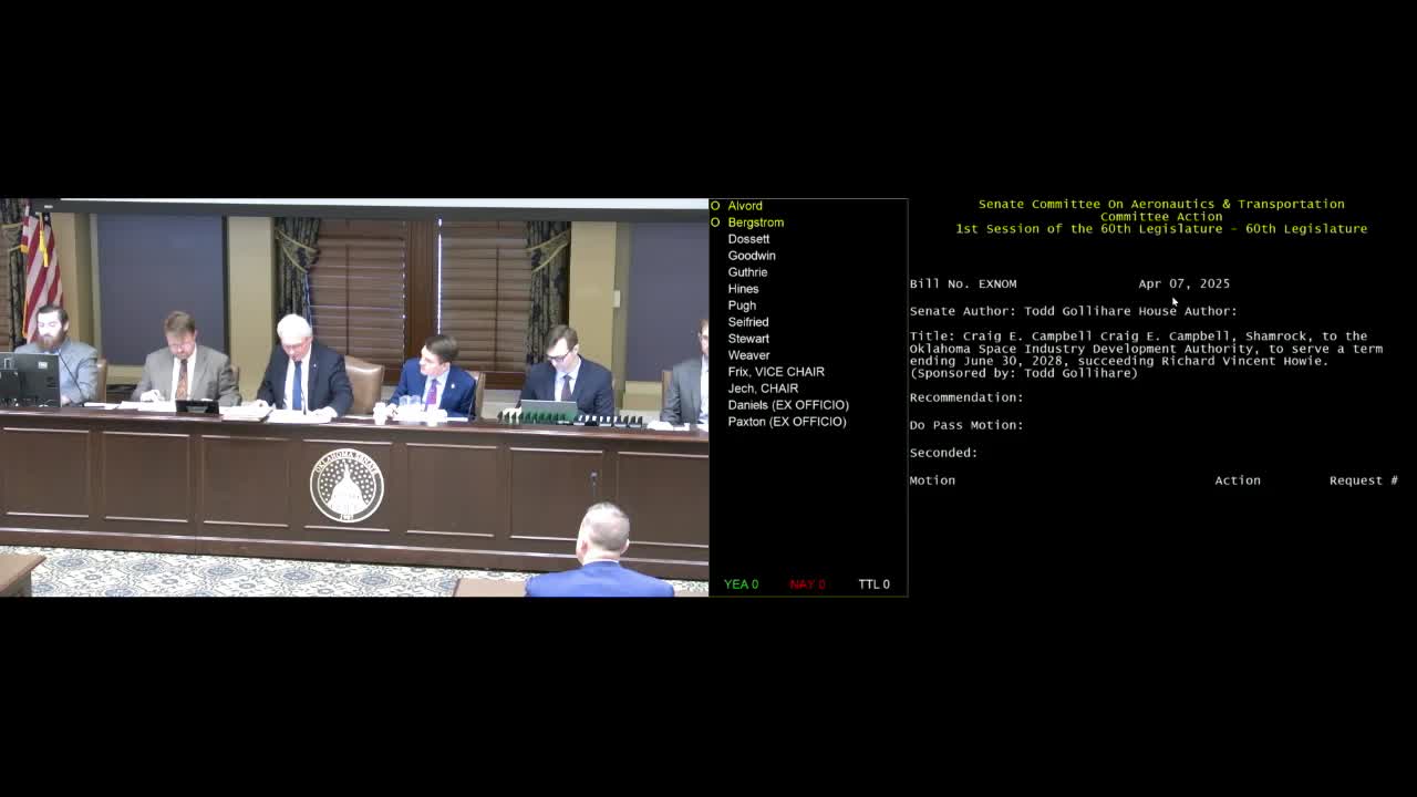 The Oklahoma Senate Aeronautics and Transportation Committee voted 11-0 to advance the nomination of Craig Campbell to the Oklahoma Space Industrial Development Authority.