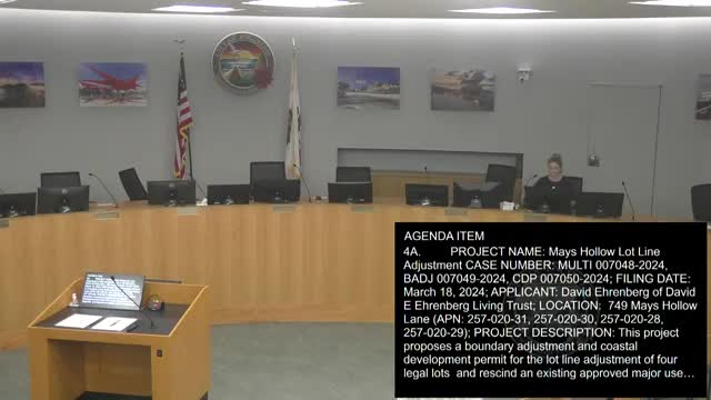 The City of Encinitas zoning administrative hearing considered a lot line adjustment and coastal development permit for four parcels at 749 Mays Hollow Lane. Staff found the application consistent with local policies but said Coastal Commission comments were still pending; no formal decision was recorded at the hearing.