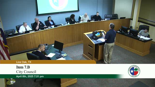 Live Oak approved a contractor proposal to replace a failing 700-foot sewer main (pipe-bursting) south of Judson Road, accepting a Fuquay Incorporated proposal for $133,288.59 plus a 10% contingency; the work is emergency repair on an easement and will proceed upon contractor notice.