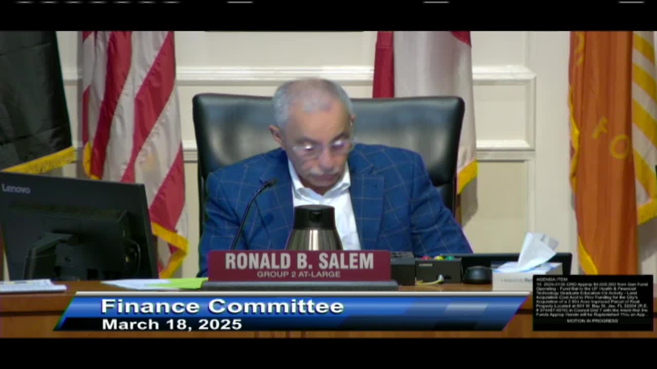The Finance Committee voted 6-0 to approve Bill 20 25 1 30 5, which increases the appropriation to $8 million to acquire a property that proponents say will support a proposed University of Florida campus.