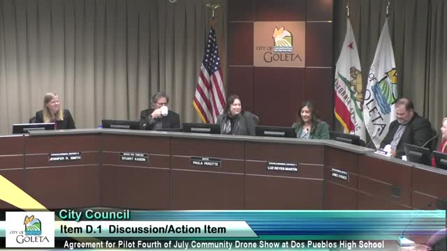 The Goleta City Council on April 1 authorized the city manager to enter into an agreement with droneshow.com LLC for a pilot Fourth‑of‑July community drone show at Dos Pueblos High School, with a contract amount not to exceed $50,000.
