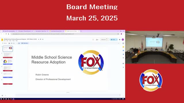 The Fox C‑6 Board of Education on March 25 approved a set of curriculum adoptions and license renewals, including a middle school science adoption of Amplify, an amended K–5 Amplify English language arts purchase adding materials for self‑contained and co‑teacher special education classrooms ($309,878.34), a one‑year renewal of the MySci elementary science license ($135,450) and a two‑year renewal of Edmentum Apex online learning for $165,000.
