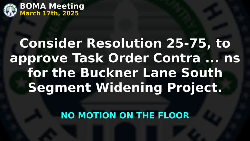 The specific votes recorded in the meeting transcript were: - Resolution 25-75: Approve task order contract with Thomas & Hutton for construction engineering inspection (CEI) services for city-owned utility relocations on the Buckner Lane South segment widening project. Motion carried 9–0. - Resolution 25-76: Approve funding request No. 1 for land acquisition purchases for tracts of the Buckner Lane Port Royal intersection improvement project. Motion carried 9–0. - Resolution 25-77: Approve Amendment No. 12 to Kimley-Horn construction-phase services for the Buckner Lane South segment widening project. Motion carried 9–0. - Resolution 25-78: Appoint members and correct terms for the City of Spring Hill Industrial Development Board. Motion carried 9–0.