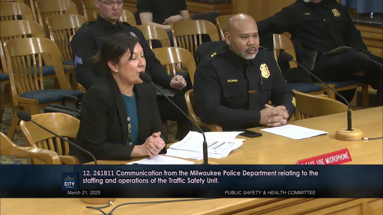 Milwaukee Police Department briefed the Public Safety & Health Committee on staffing and performance of the Traffic Safety Unit; officials said the unit continues to handle a large share of speeding citations but has dropped from about 20 officers at its peak to nine and that districts still enforce traffic laws.