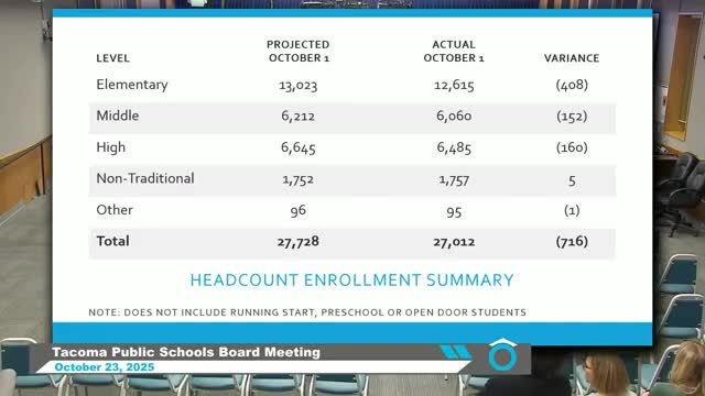 Facing an October head count below projections and a fund balance well under its 5% reserve target, the Tacoma School District board approved ballot measures to renew two levies, authorized a temporary interfund loan and approved contracts and grants including a five‑year agreement with Hilltop Artists.