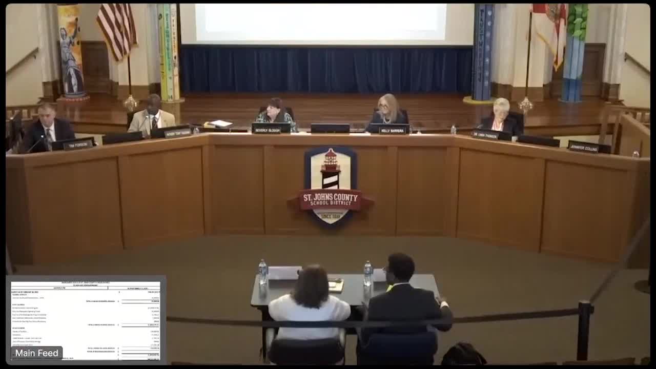 The St. Johns County School Board approved a general fund budget amendment after a downward state funding adjustment tied to FEFP calculations and also amended the First Coast Technical College budget to add a state CTE incentive grant.