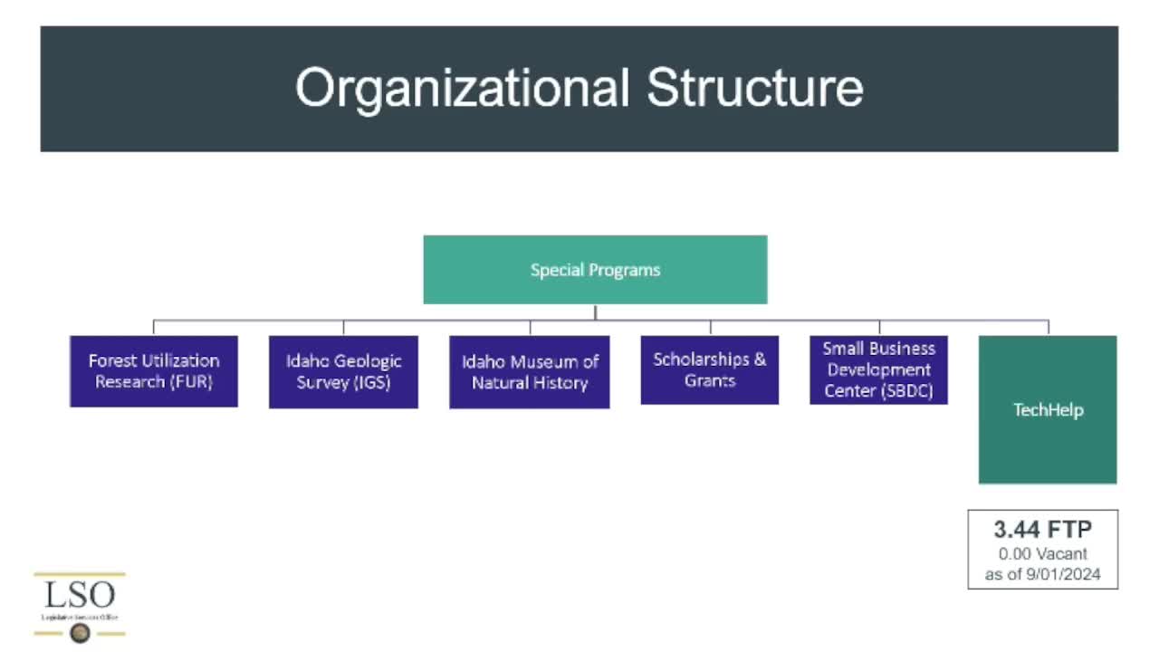 TechHelp is organized at Boise State University, reported 3.44 authorized FTP and said it historically spends nearly all of its appropriation on personnel. McDonald described Studio Blue as the unit focused on design, prototyping and workforce experience: students who complete Studio Blue projects may have substantial applied hours and clients report project outcomes. TechHelp uses nationally standardized impact metrics to measure results — including new and retained jobs, sales growth, cost savings and client satisfaction — and McDonald said recent quarterly measures ranked among the highest in the national network.