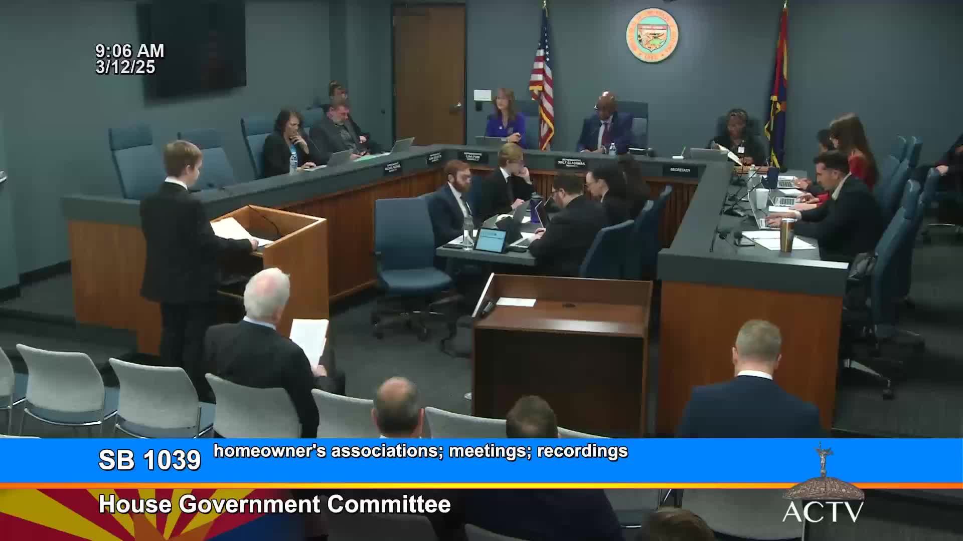 The House Committee on Government voted 7-0 to give Senate Bill 1039 a due-pass recommendation. The bill would require homeowners association boards to retain any recorded meeting for six months and make copies available on request; sponsor said the change targets a small share of abusive HOA practices.
