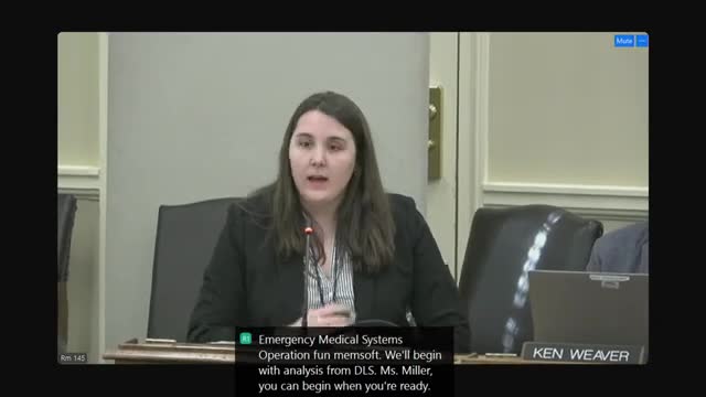 Madeline Miller, a fiscal analyst at the Department of Legislative Services, presented the DLS forecast for the Maryland Emergency Medical System Operations Fund (MEMSOF), describing recent statutory changes that altered fund revenue and the divergent DLS and Department of Budget and Management (DBM) projections for the fund's balance through the next decade.