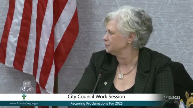 The Tualatin City Council on Jan. 13 approved a proclamation recognizing blood donor month at the request of Bloodworks Northwest and declined a request for a Health for Humanity Yogathon proclamation, saying the Yogathon request looked like an event announcement rather than a recurring civic proclamation.
