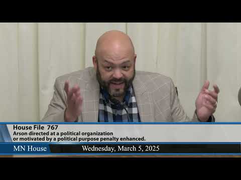 Representative Matt Hudson introduced House File 767 to the Minnesota House Public Safety Committee on March 5, 2025, proposing an enhanced first-degree arson penalty when a fire damages a building that houses a political organization or when the offense was committed "in whole or substantial part" to make a political statement.