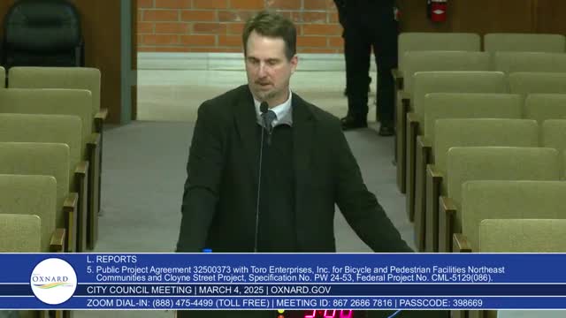 The Oxnard City Council approved a public project agreement with Toro Enterprises to build bicycle and pedestrian improvements in northeast Oxnard, including Class II and III bike lanes, traffic-signal bicycle detection, an overhead flashing beacon, curb extensions, striping and accessibility work.