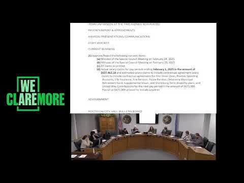 At a February 2025 Claremore meeting, the council approved the agenda and consent items, heard a public comment condemning drag performances before children, and received reminders about a March education event, a Thursday town hall and ongoing pothole repairs.