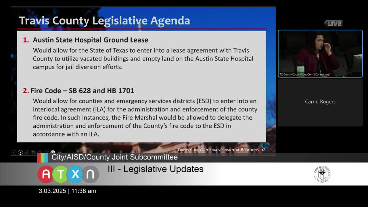 Travis County deputy intergovernmental relations officer Cecily Kaye told a joint subcommittee of county, city and school officials on March 3 that the county is pursuing six local bills this legislative session, including a proposal to allow state-owned Austin State Hospital property to be leased to the county for mental‑health and jail‑diversion services.